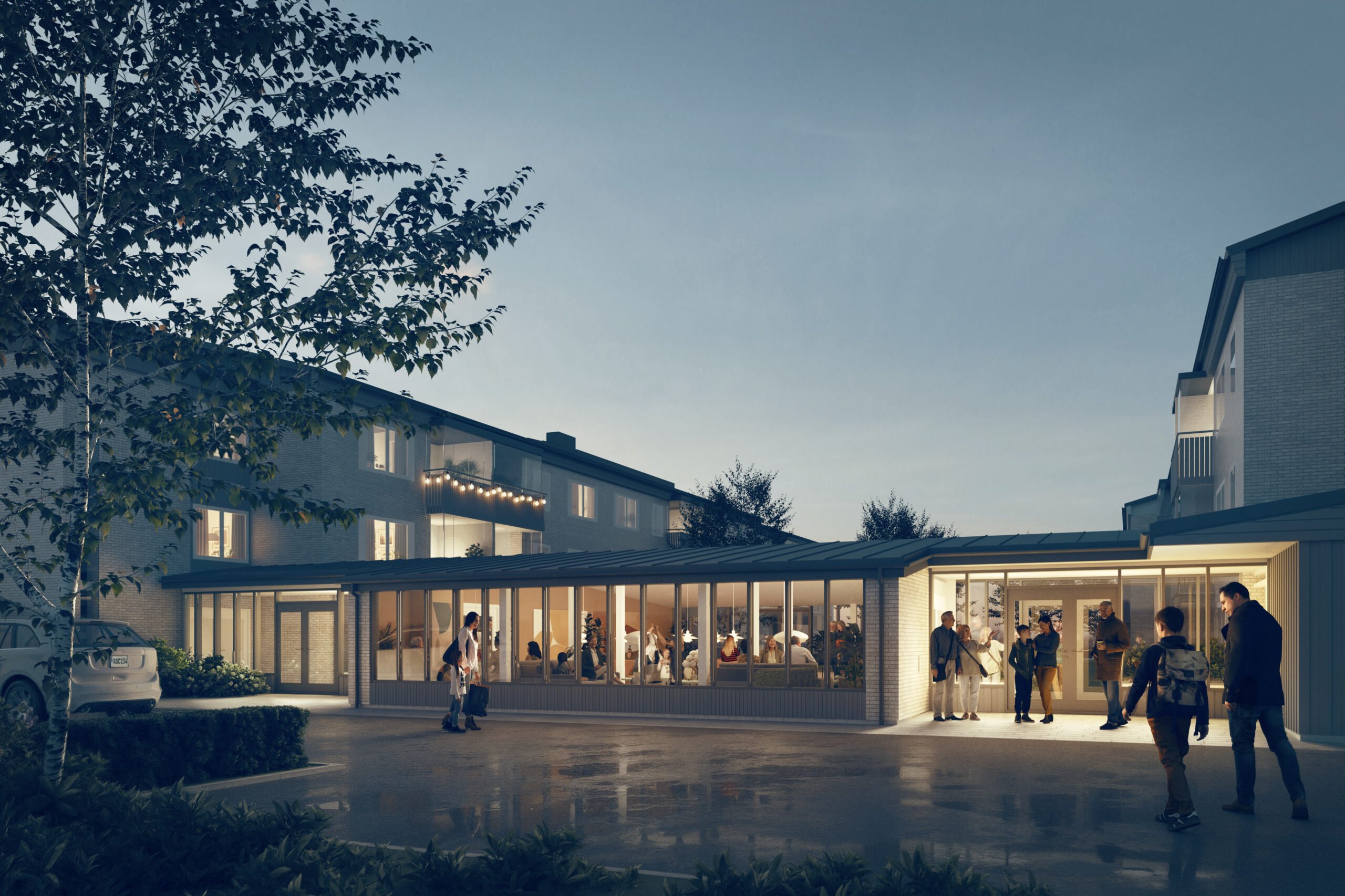 Rendering av ett seniorboende i trä med klassisk fasad, människor och en hund på gårdsplanen vintertid.
