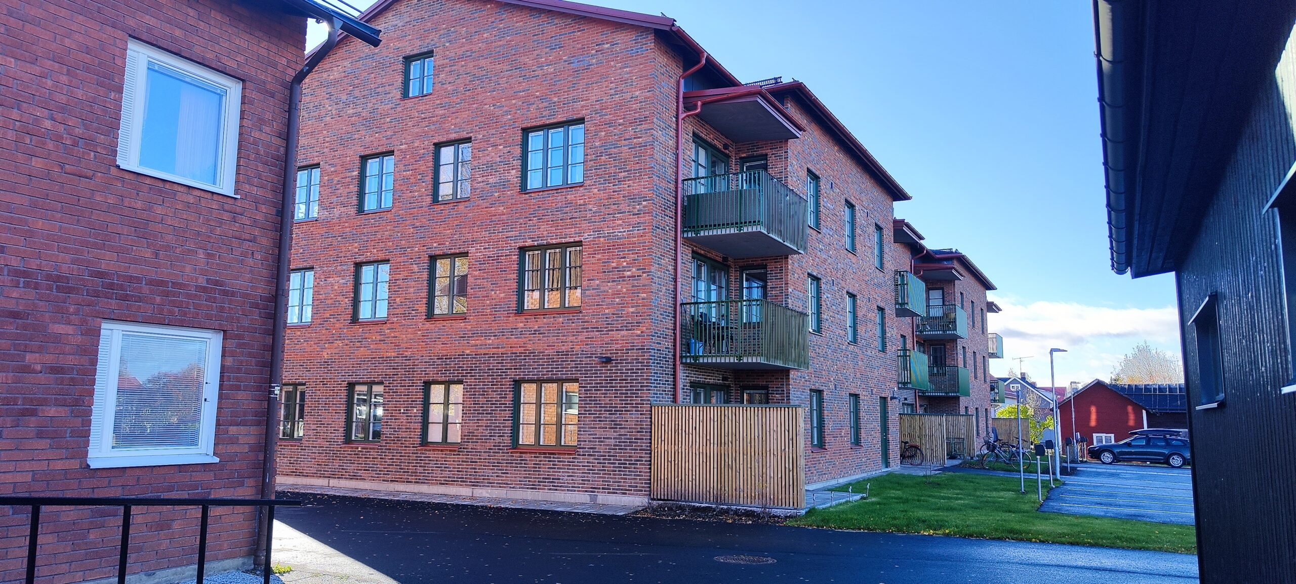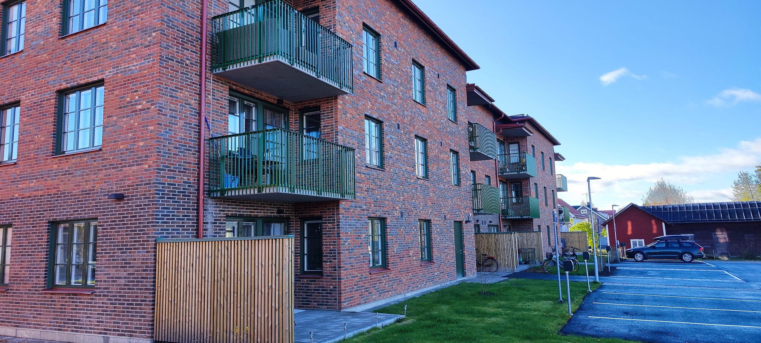 Flerbostadshuset är byggt med platsgjuten betongstomme och en ljusbeige tegelfasad som ger både hållbarhet och ett tidlöst uttryck. I anslutning till huset uppfördes även carportar och ett tillhörande miljöhus.